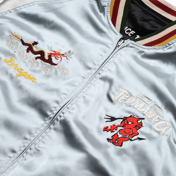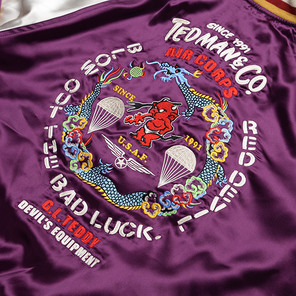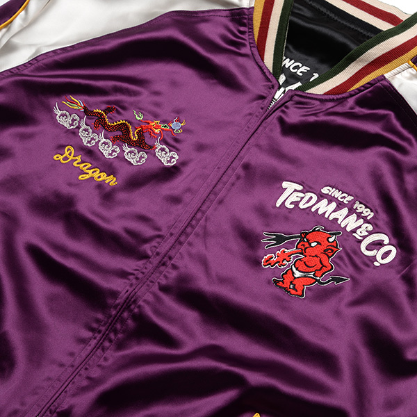 龍がテッドマンを囲んだ派手なデザイン。対照的に裏面の刺繍はチェーンステッチ仕様。表裏共にレーヨン風ヘビーポリサテンを使用した大人な一着です。