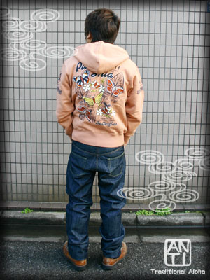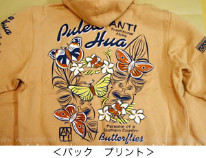 大胆な配色がいかにも南国風。『プレレフア』とは蝶の意味で、文字デザインとの組み合わせによってアロハ調な仕上がりになっている。背景には『アクア(神)』の木彫り『TIKI』が配置されている。