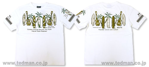 ベースにはパームツリーが描かれており、胸の部分にウクレレ&サーフボードが配列され。