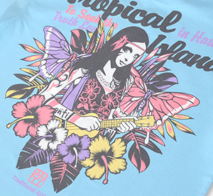 ウクレレを持ったハワイの女性のまわりにカラフルなハイビスカスや蝶が配置されたデザイン