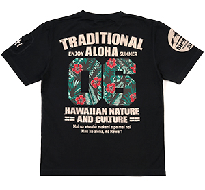 ハワイの植物やハイビスカスが配置されたカレッジ風TEEです。