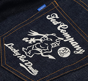テッドマンとカミナリのロゴを左右にプリントしたバックポケットはインパクト大!プリントならではの経年変化も楽しめる一本