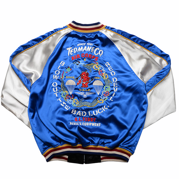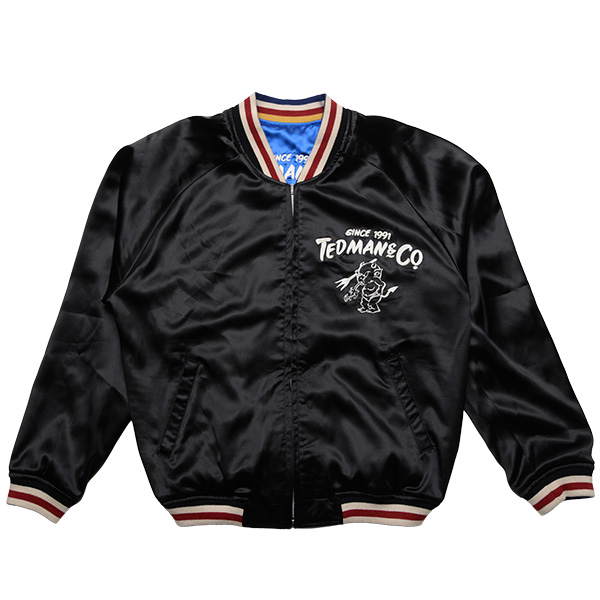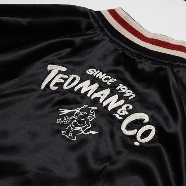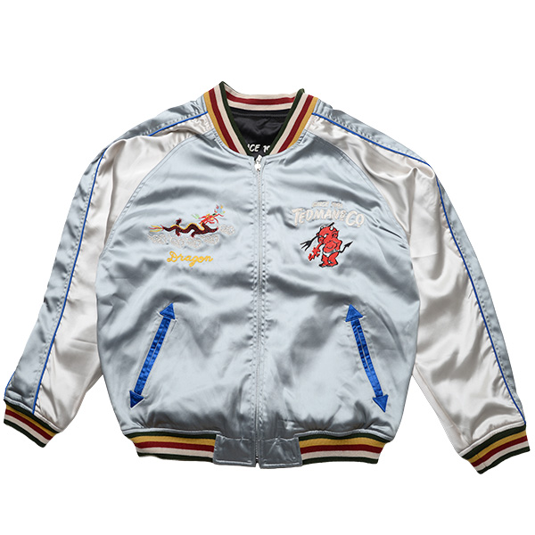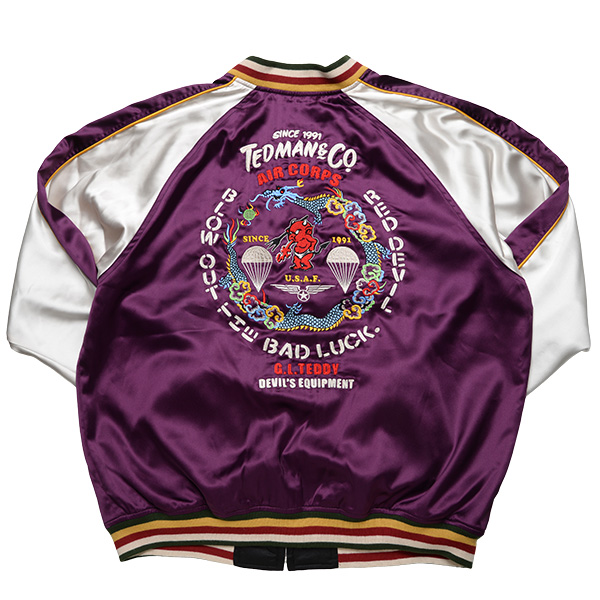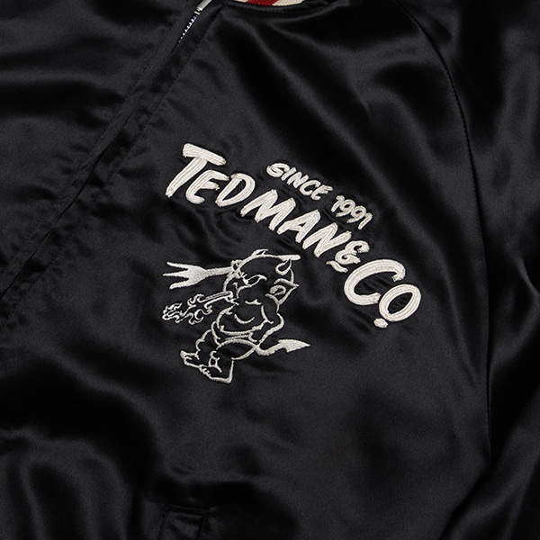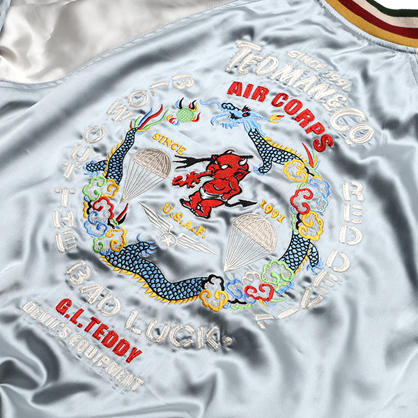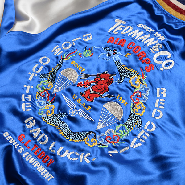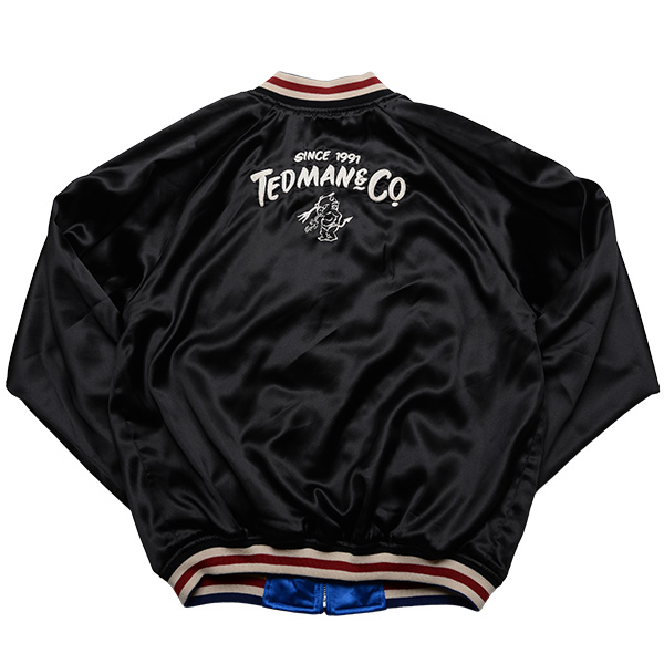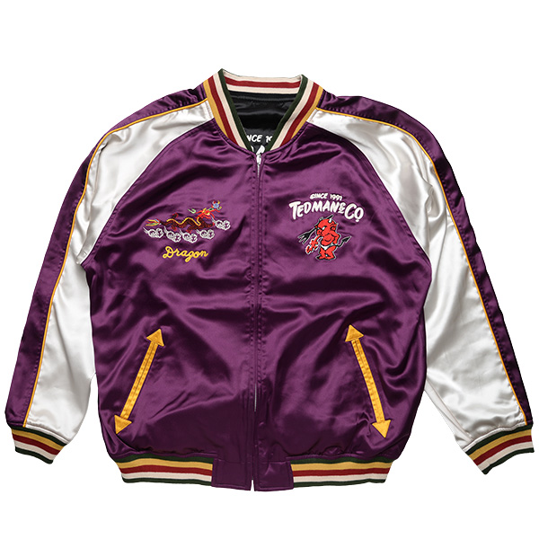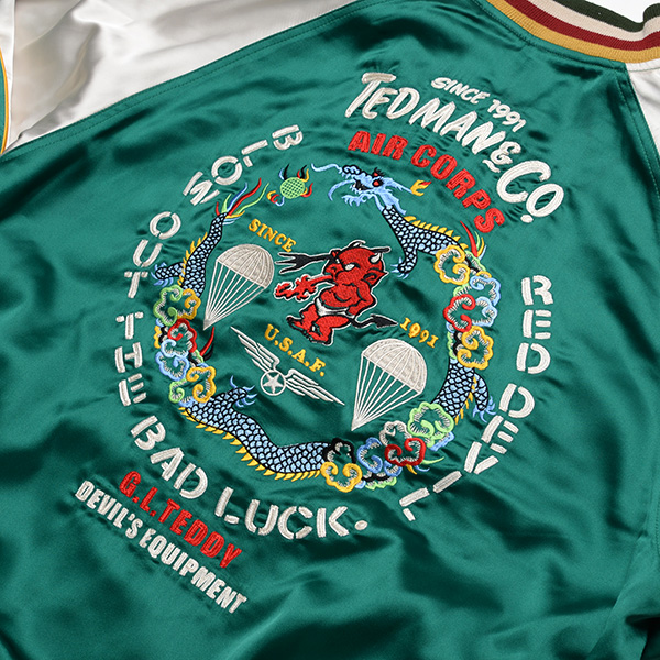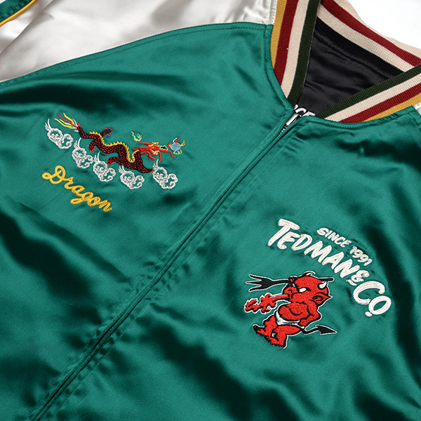 龍がテッドマンを囲んだ派手なデザイン。対照的に裏面の刺繍はチェーンステッチ仕様。表裏共にレーヨン風ヘビーポリサテンを使用した大人な一着です。