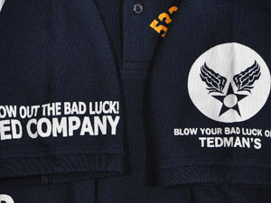 ポロシャツを造ろうと思ったのが数年前のこと。ワンポイント刺繍でTEDちゃんを胸に、と考えたがそれでは能が無い!TEDMANの独特なグラフィックをドカーンと表現したい造り始めたが、鹿の子の凹凸が邪魔をして綺麗に表現出来なかったのです...。しかし諦めず努力の甲斐あってジャージャジャーン!!なんと完成しました!!