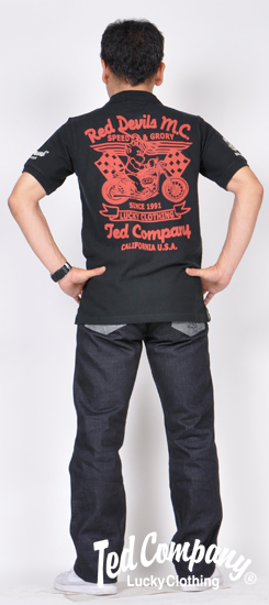 チェッカーフラッグをバッグにチョッパーに跨がるテッドマン。バイク好き必見のモーター系デザイン。抜染だからグラフィックも鮮やかで通気性も抜群だ!