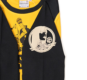 スタンドマイクを手に、クールな出で立ちの姉御。 ピークド・イエロー シリーズで人気の高い ''KISS MY TATTOO''のデザインを起用。