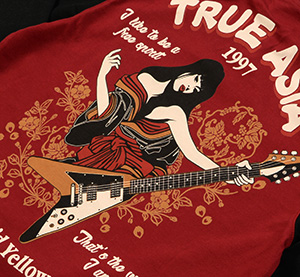 数々の有名ギターリストが使用してきた、その独自のフォルムが目を惹くフライングVギターをセクシーな姉御が弾くグラフィック