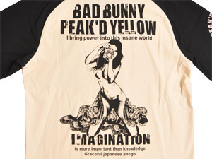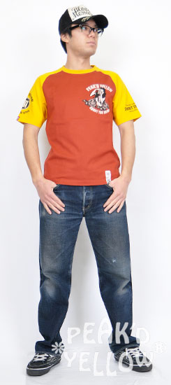 狙った獲物は逃さないカメラマン姐御。というか、この格好で撮影されたらオトコどもは動く事もままならない…。かすれ風のプリントも効いたラグランTシャツは、春・夏カジュアルには必携。姐御に心奪われましょう!