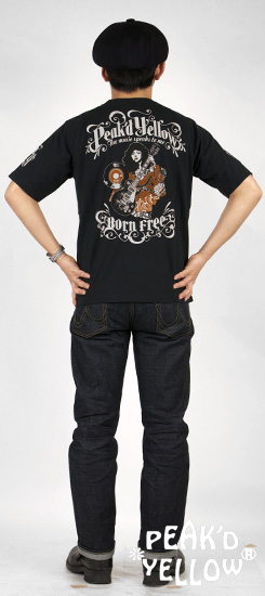 くわえタバコにエレキギター、そしてレコードを片手に睨みをきかす姐御。着物の細やかなデザインまで見事に表現されたプリントの技術に脱帽。